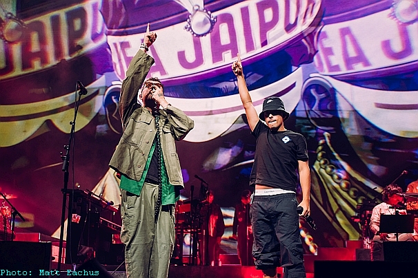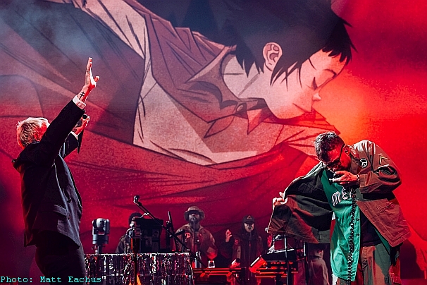 Definitely not the 2-D aka Damon Albarn show, despite his front man role; Noodle on guitar and Murdoc on bass are vibrant and jumping in constant motion, adding that rock gloss on the other stylings. There are plenty of other musical shapes. Two tabla players open proceedings and, added to two drummers, make for a multi-rhythmic monster, propelling the cartoon adventures of Stylo and the gang. With thirteen people on stage, the epic sound is as full and wide as the video screens. Speaking of which, I’m dubious of playing to video but the interaction was two-way, allowing Albarn to throw in a curve-ball at the end with some freestyling, and the projections just having to catch up.